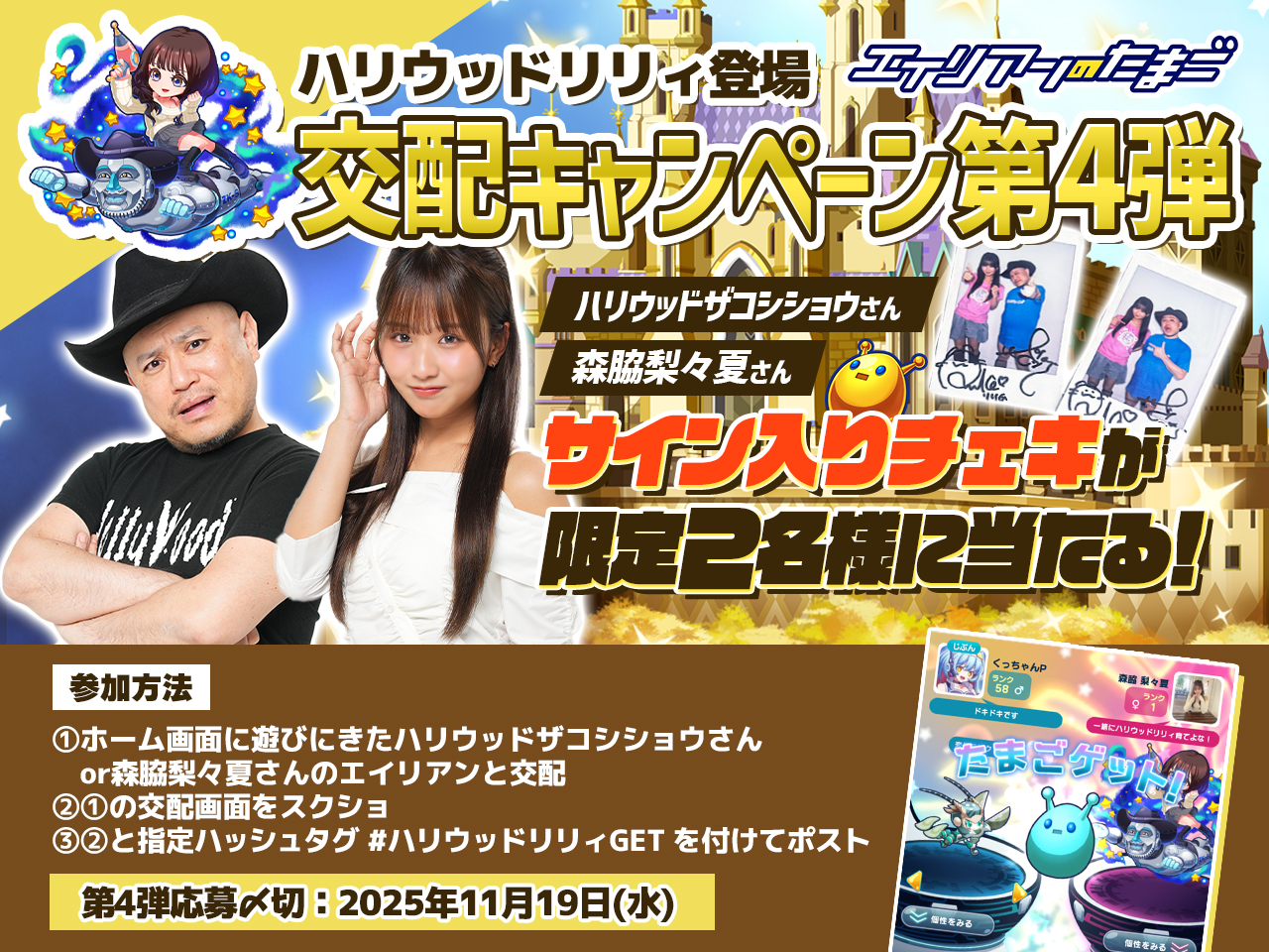 公式アンバサダーをつとめるハリウッドザコシショウさん&森脇梨々夏さんのお二人をモチーフとした「ハリウッドリリィ」が、交配限定エイリアンとしてゲーム内に登場いたしました!こちらを記念して、お二人のサイン入りチェキが当たる交配キャンペーンを開催いたします。ぜひご参加をお待ちしております。