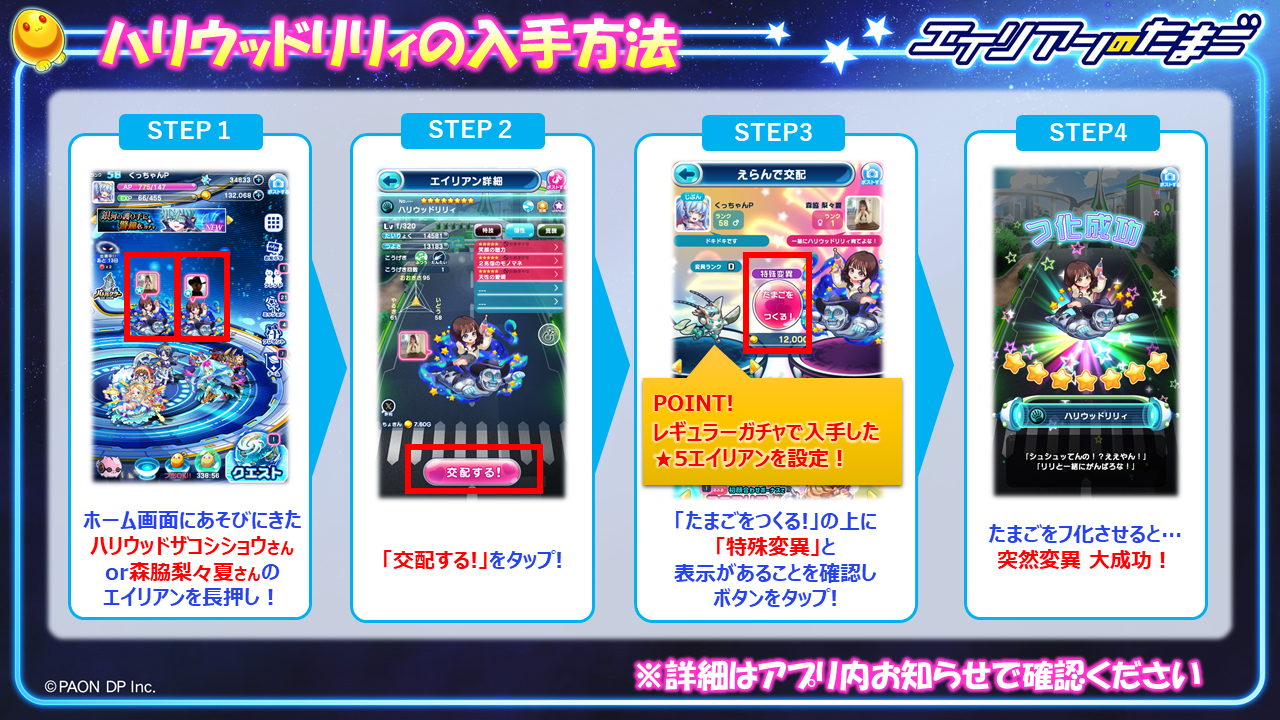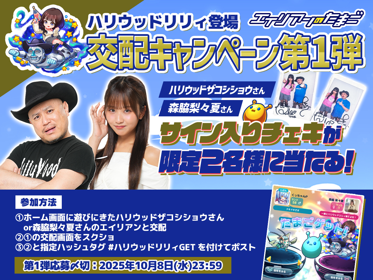 公式アンバサダーをつとめるハリウッドザコシショウさん&森脇梨々夏さんのお二人をモチーフとした「ハリウッドリリィ」が、交配限定エイリアンとしてゲーム内に登場いたしました!こちらを記念して、お二人のサイン入りチェキが当たる交配キャンペーンを開催いたします。ぜひご参加をお待ちしております。