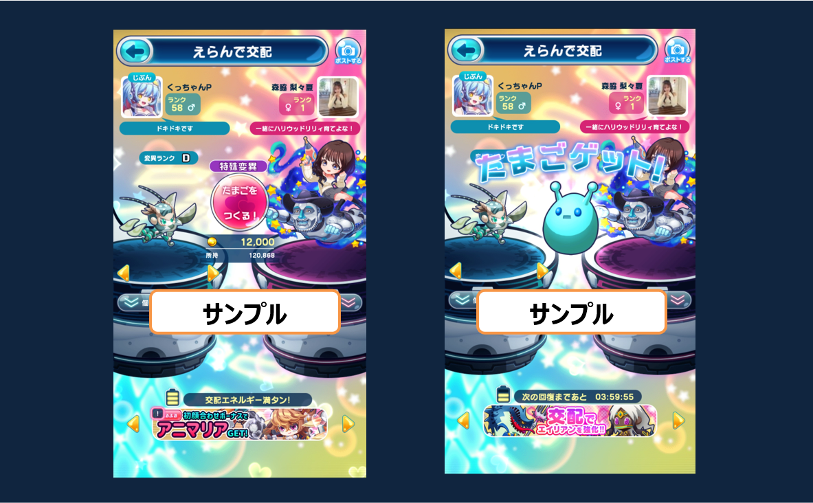 ⑤えらんで交配の画面で「たまごをつくる!」ボタンをタップで交配完了!