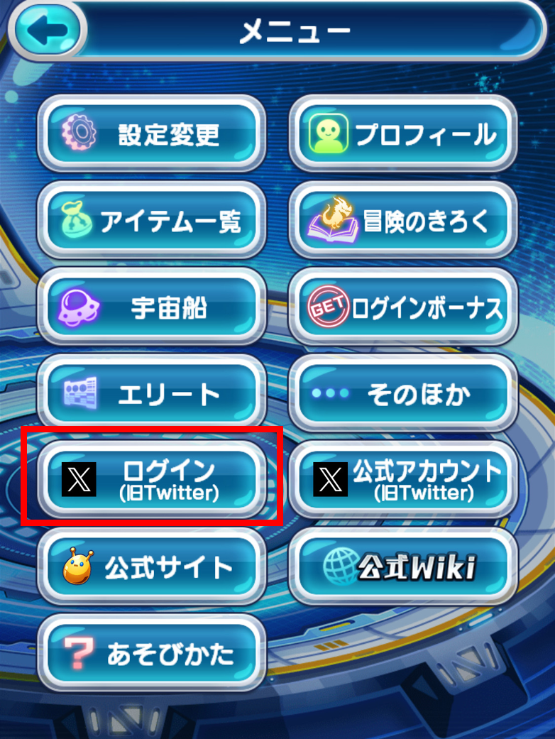1.「エイリアンのたまご」ホーム画面の「メニュー」→「ログイン」をタップしてください。