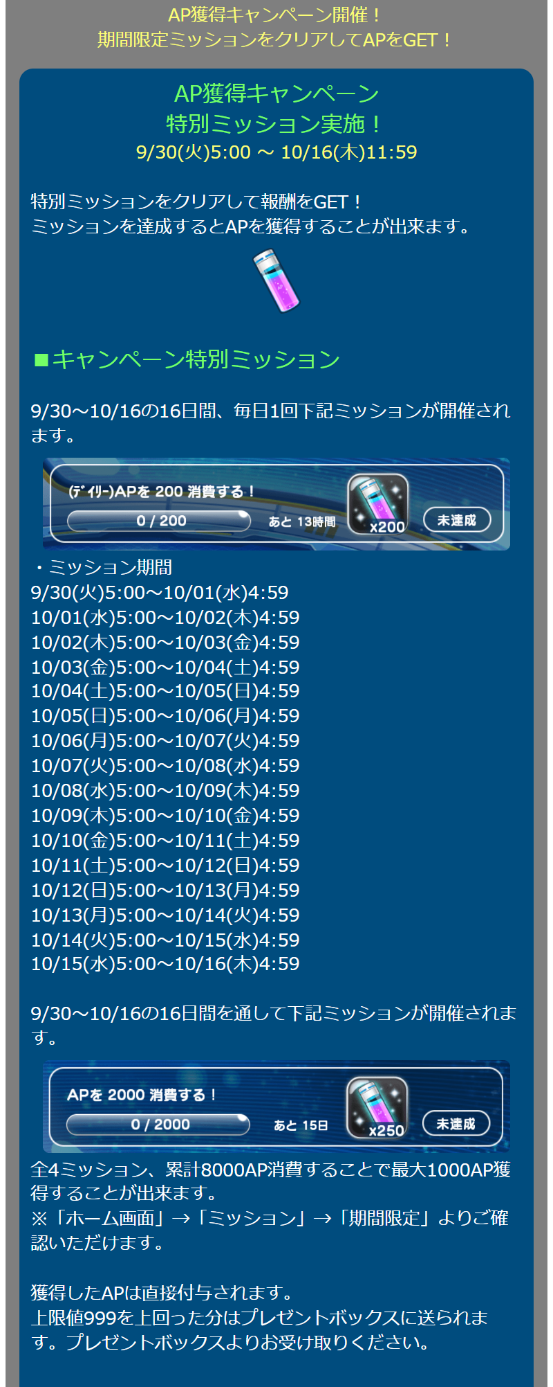 AP獲得キャンペーン 特別ミッション実施! 9/30(火)5:00 ~ 10/16(木)11:59