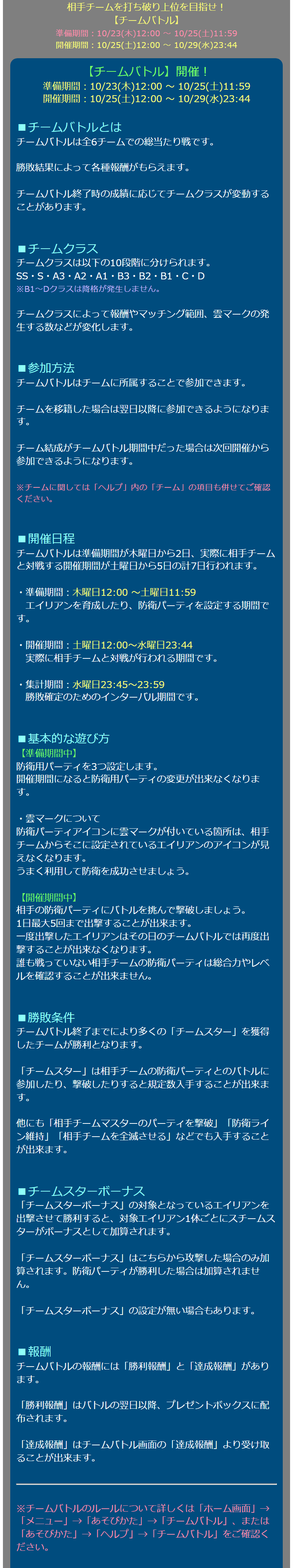 【チームバトル】開催! 準備期間:10/23(木)12:00 ~ 10/25(土)11:59 開催期間:10/25(土)12:00 ~ 10/29(水)23:44