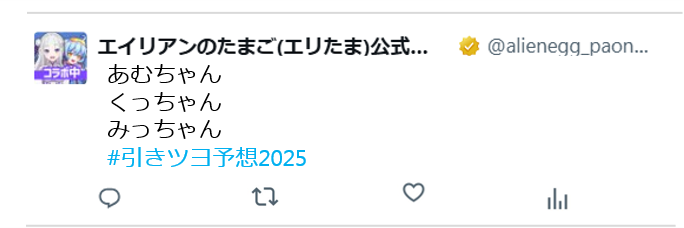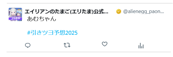 ②指定ハッシュタグ「#引きツヨ予想2025」をつけて①で選んだ人の名前をポスト。もしくは「#引きツヨ予想2025」をつけてキャンペーン告知ポストを引用リポストしてください。
