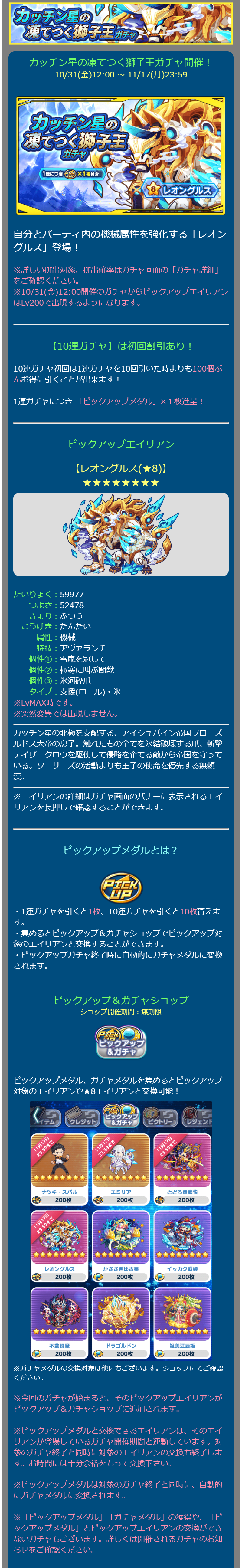カッチン星の凍てつく獅子王ガチャ開催! 10/31(金)12:00 ~ 11/17(月)23:59