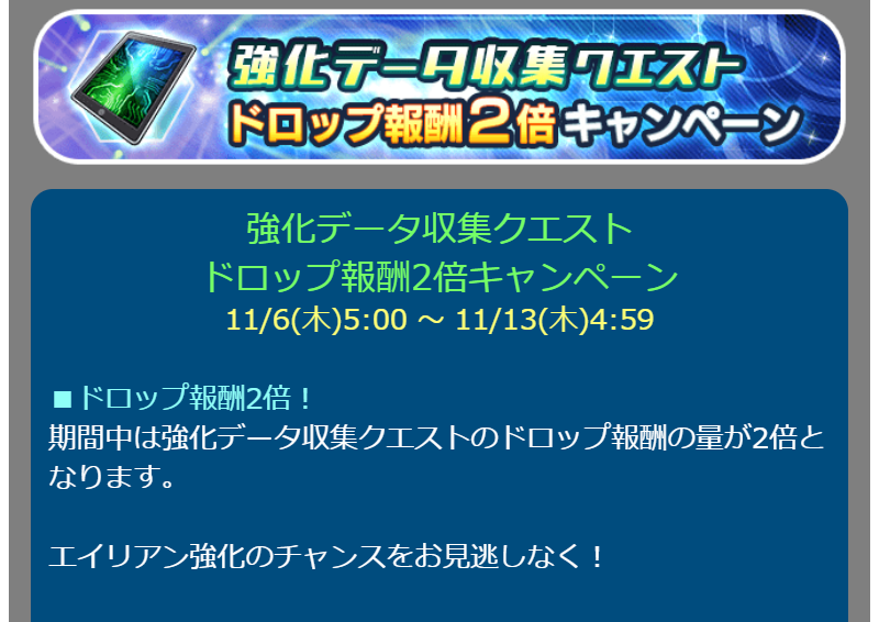 強化データ収集クエスト ドロップ報酬2倍キャンペーン 11/6(木)5:00 ~ 11/13(木)4:59