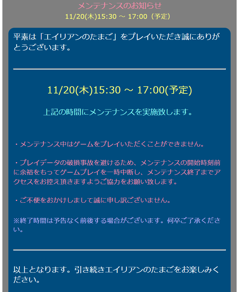 サーバーメンテナンスのお知らせ 11/20(木)15:30 ~ 17:00(予定)
