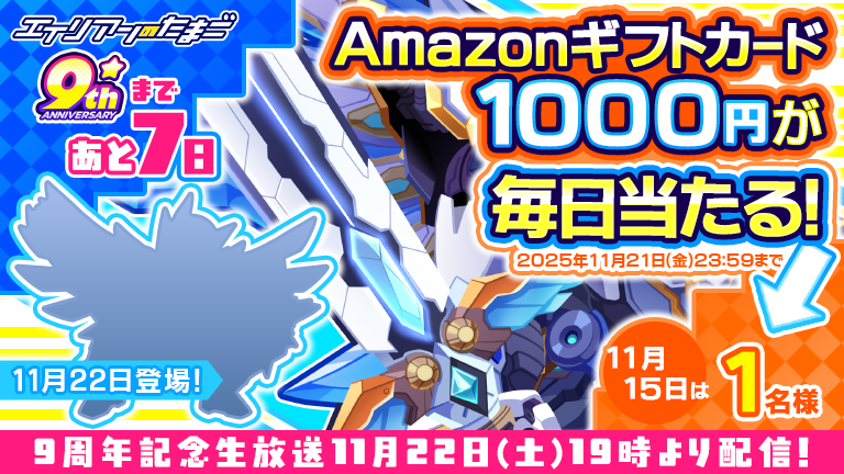おかげさまでエリたまはまもなく9周年を迎えます。来たる11月22日、9周年記念イベント開催へのカウントダウンに合わせて「Amazonギフトカード」が毎日当たるカウントダウンキャンペーンを開催いたします。