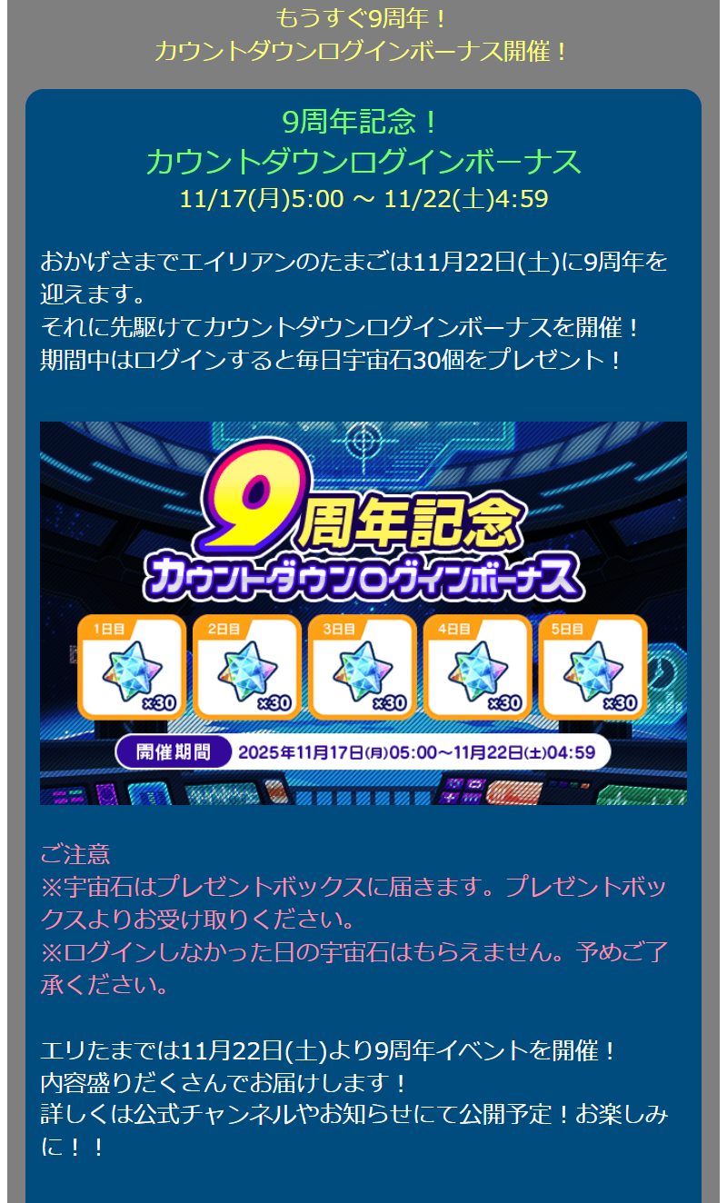 9周年記念! カウントダウンログインボーナス 11/17(月)5:00 ~ 11/22(土)4:59