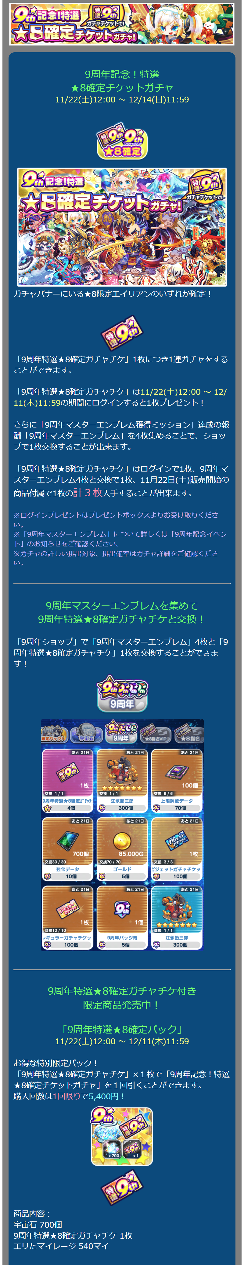 9周年記念!特選 ★8確定チケットガチャ 11/22(土)12:00 ~ 12/14(日)11:59