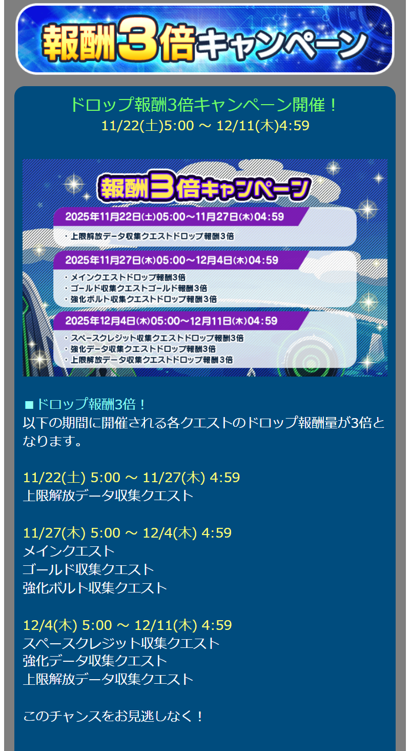ドロップ報酬3倍キャンペーン開催! 11/22(土)5:00 ~ 12/11(木)4:59