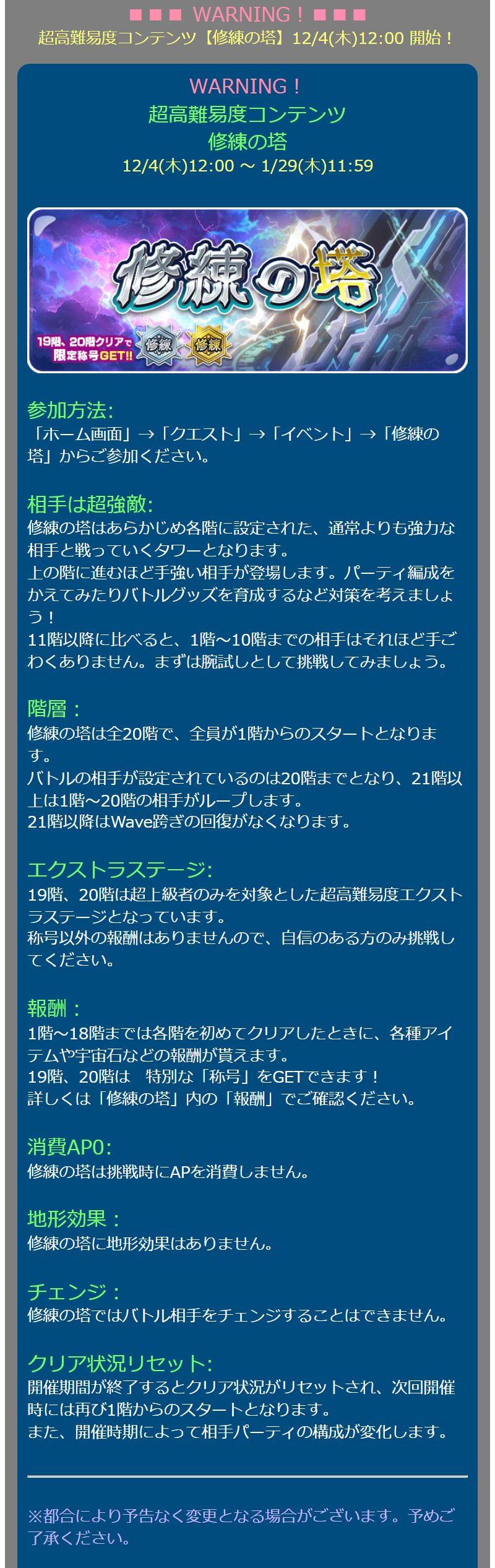 超高難易度コンテンツ「修練の塔」開催! 12/4(木)12:00 ~ 1/29(木)11:59