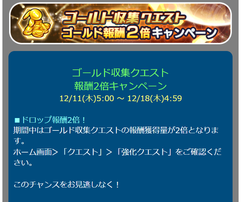 ゴールド収集クエスト 報酬2倍キャンペーン 12/11(木)5:00 ~ 12/18(木)4:59