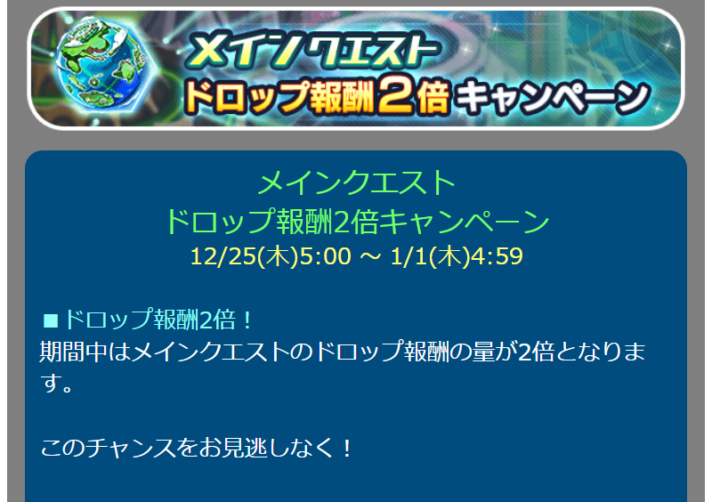 メインクエスト ドロップ報酬2倍キャンペーン 12/25(木)5:00 ~ 1/1(木)4:59