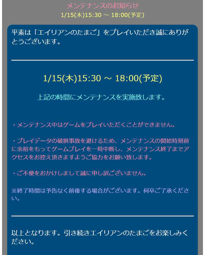 サーバーメンテナンスのお知らせ 1/15(木)15:30 ~ 18:00(予定)