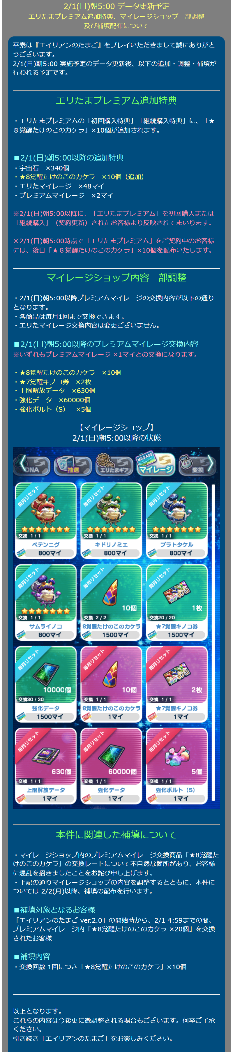 2/1(日)朝5:00 データ更新予定 エリたまプレミアム追加特典、マイレージショップ一部調整 及び補填配布について