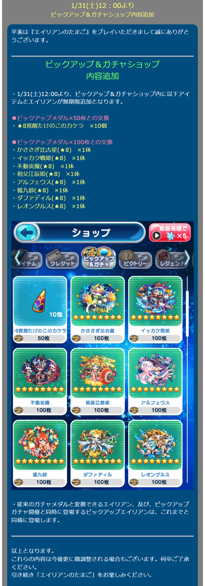 ピックアップ&ガチャショップ 内容追加 1/31(土)12:00より