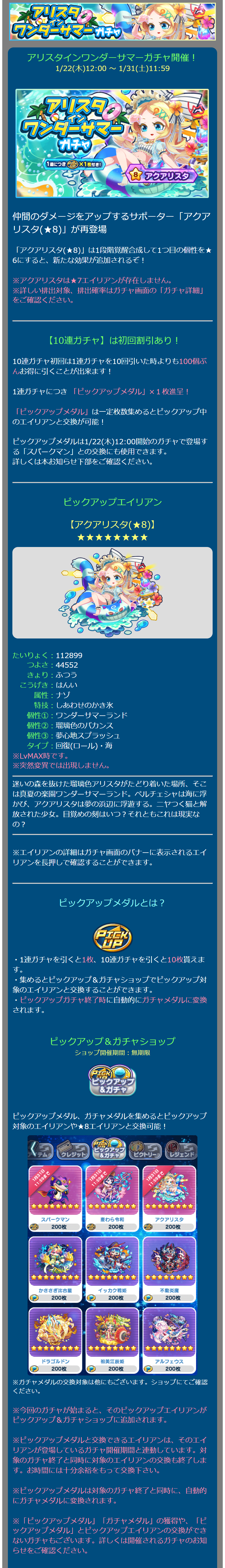 アリスタインワンダーサマーガチャ開催! 1/22(木)12:00 ~ 1/31(土)11:59