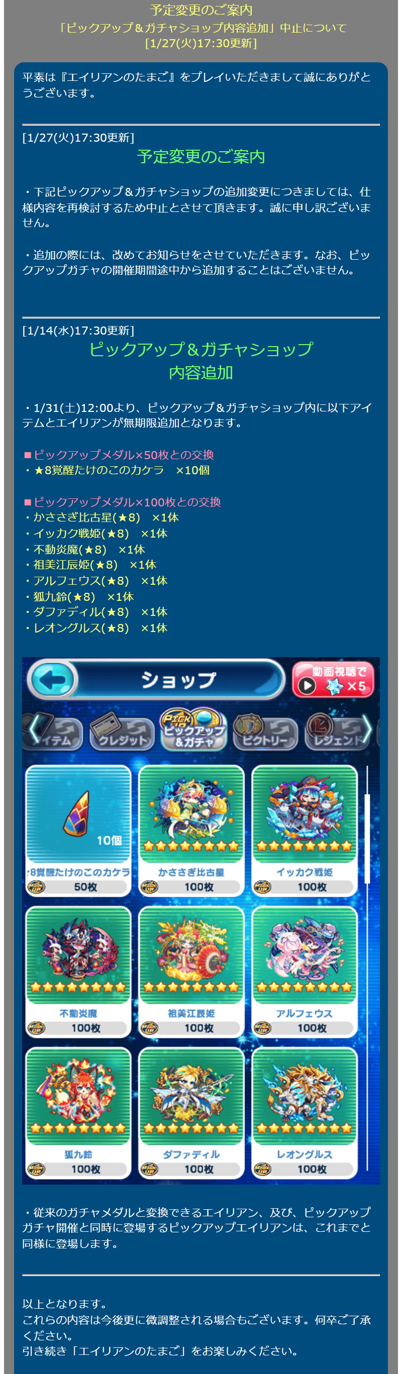 予定変更のご案内 「ピックアップ&ガチャショップ内容追加」中止について
