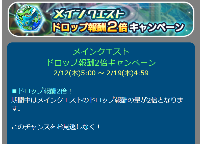 メインクエスト ドロップ報酬2倍キャンペーン 2/12(木)5:00 ~ 2/19(木)4:59