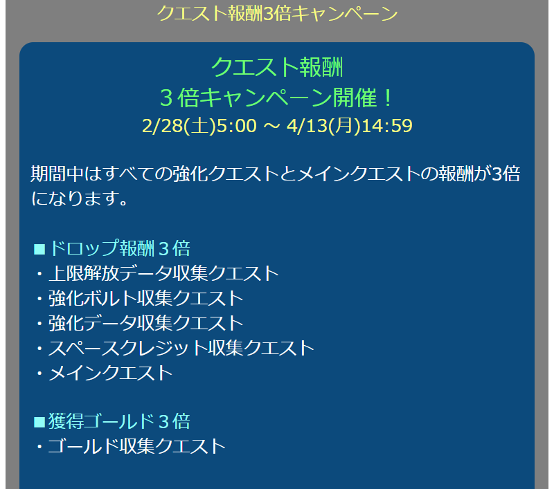クエスト報酬3倍キャンペーン開催! 2/28(土)5:00 ~ 4/13(月)14:59