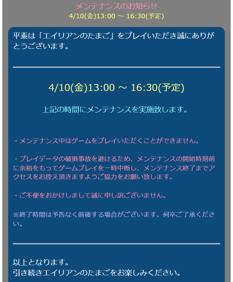 サーバーメンテナンスのお知らせ 4/10(金)13:00 ~ 16:30(予定)
